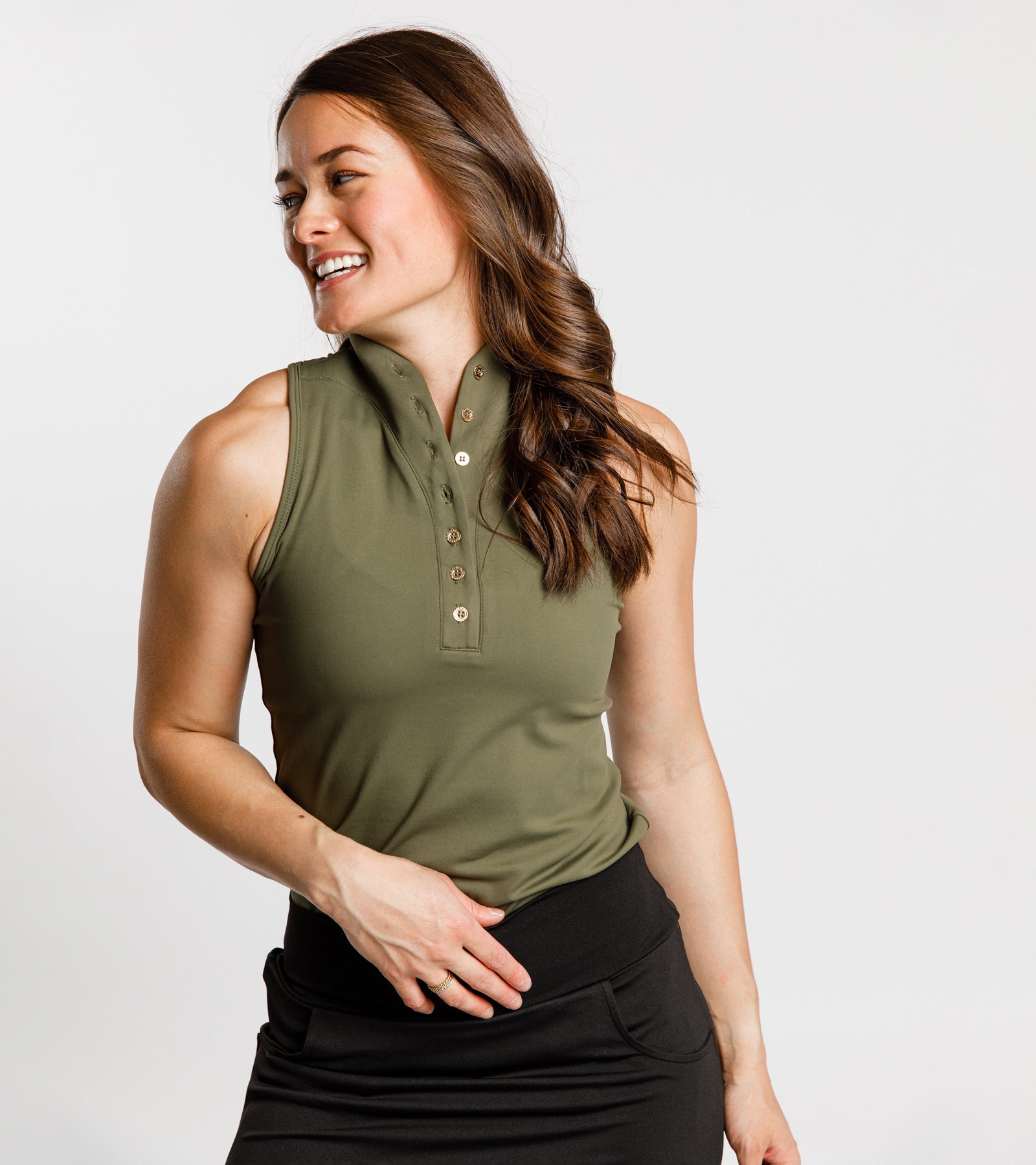 Iconic and timeless with the CALLIOPE signature rose gold buttons. This high mock neck brings a sleek look to the course that won't go out of style. The buttery soft fabric will leave you wondering how you'll ever go back to wearing another polo again.