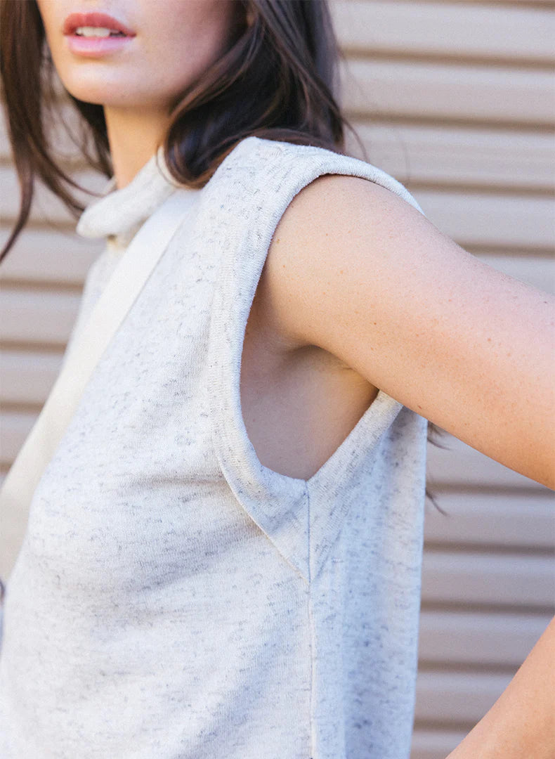 This easy Mock Neck Muscle Tank hits at our classic length at the high hip and features rolled cuffs and side seam slit details. This versatile tank is made in a super soft marled knit, perfect to pair with any bottom.