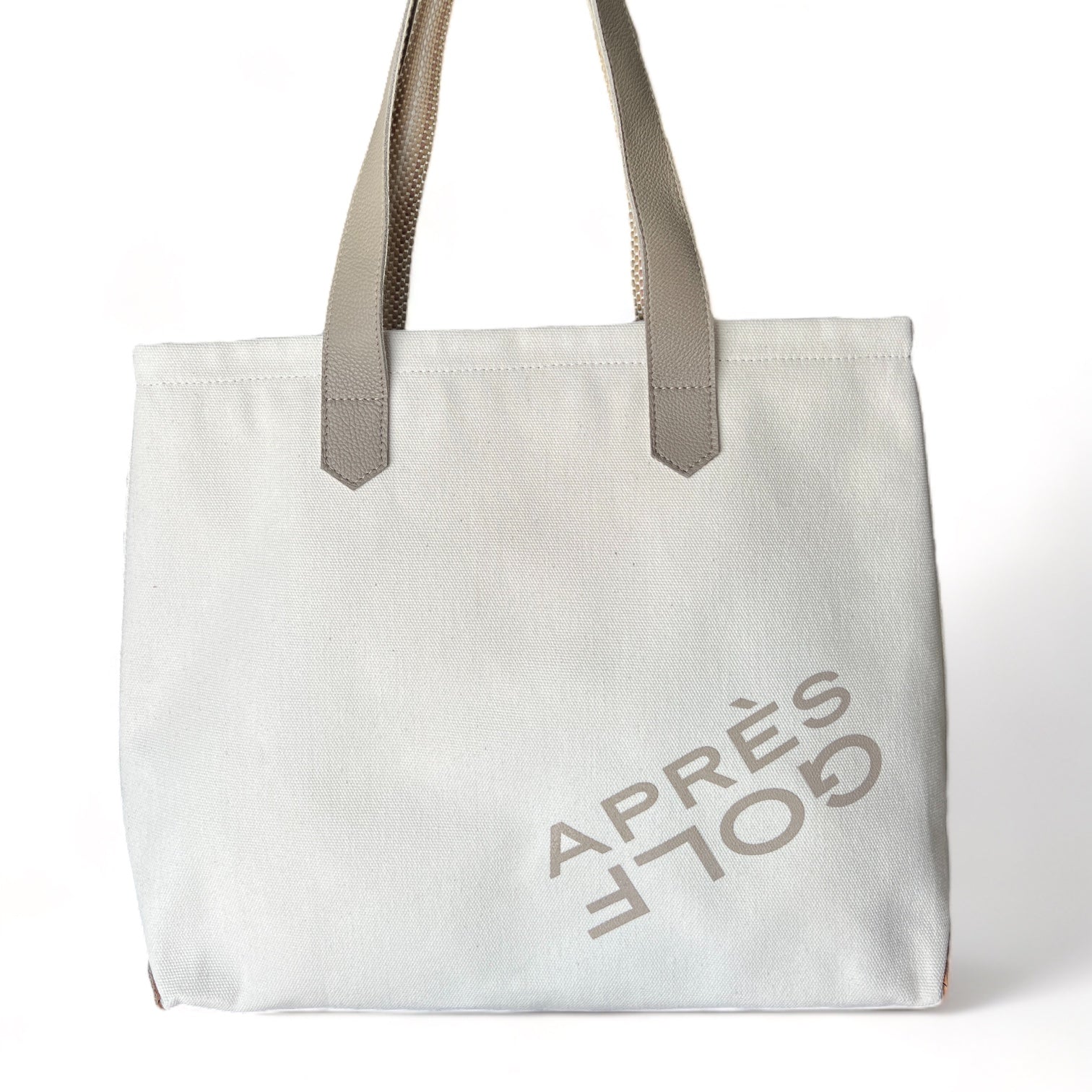 Exterior features a large, leather pocket on one side, "APRÉS GOLF" screenprint graphic on the other side (green screenprint to match leather), and a gold zippered top closure