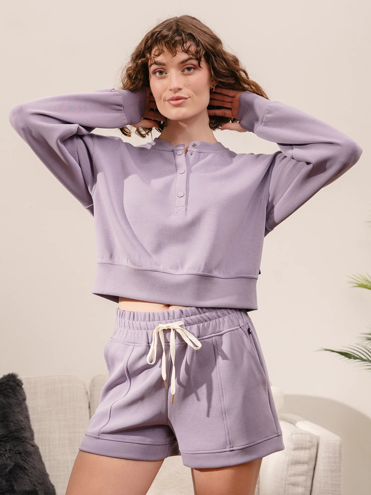 Our Ultraluxe Pintuck Short is an easy lounge short with a drawcord for adjustability, pintuck detail, and slash pockets. These shorts are made in Ultraluxe, our super soft scuba fabric. Pairs perfectly with our Ultraluxe Crop Henley Pullover for a matching set for lounging.