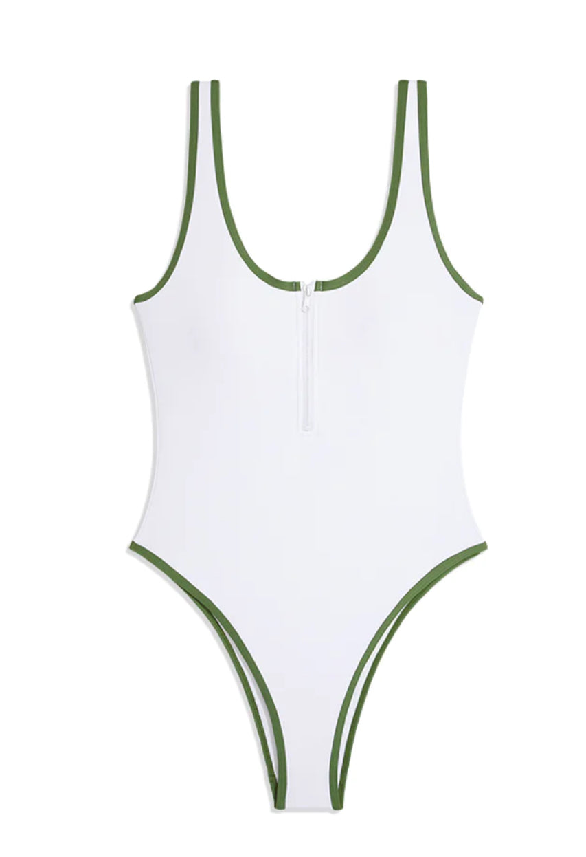 The Zip Front One Piece comes in our nylon swim fabric. It’s cut high at the leg and features binding along the edges.