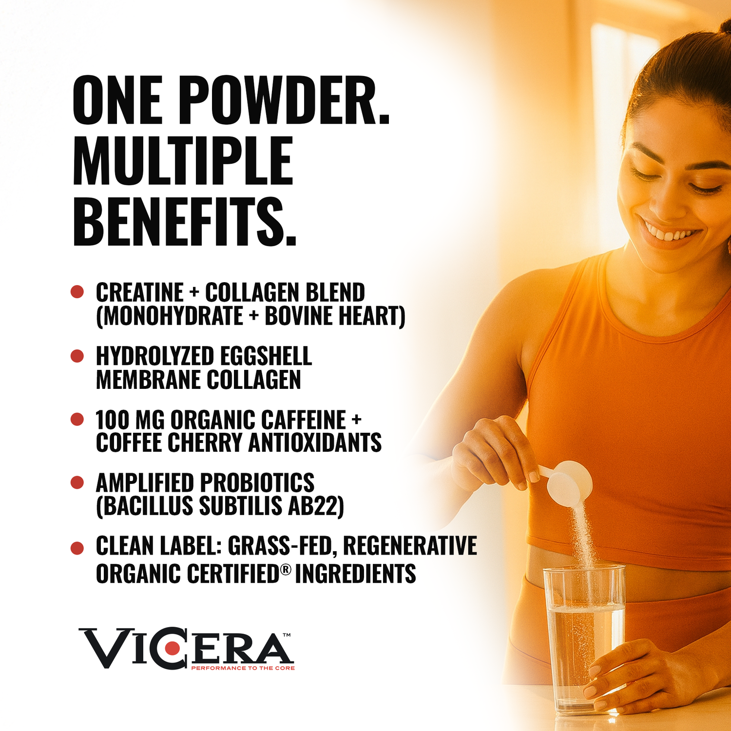 ViCera Creatine x Collagen x Caffeine powder is a REVOLUTIONARY formulation that combines the power and potency of creatine monohydrate, hydrolyzed eggshell membrane collagen, and Regenerative Organic Certified® grass-fed bovine heart (a natural source of creatine, collagen, and more), organic caffeine plus antioxidants from coffee cherry. It is a potent combo that provides energy, supports muscular strength and endurance, improves exercise recovery, promotes healthy joints, ligaments and tendons, and supports a healthy inflammation response.†