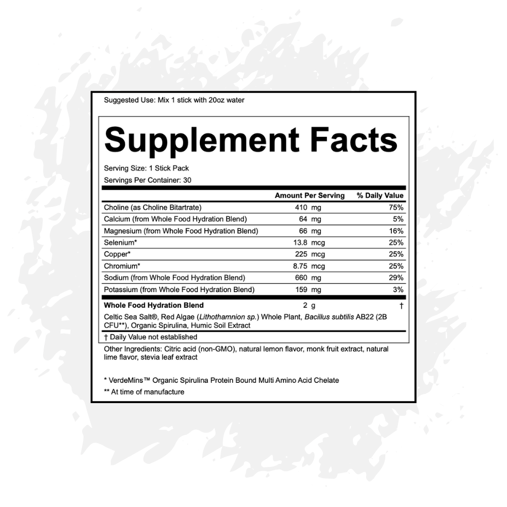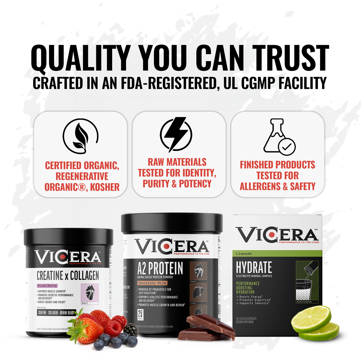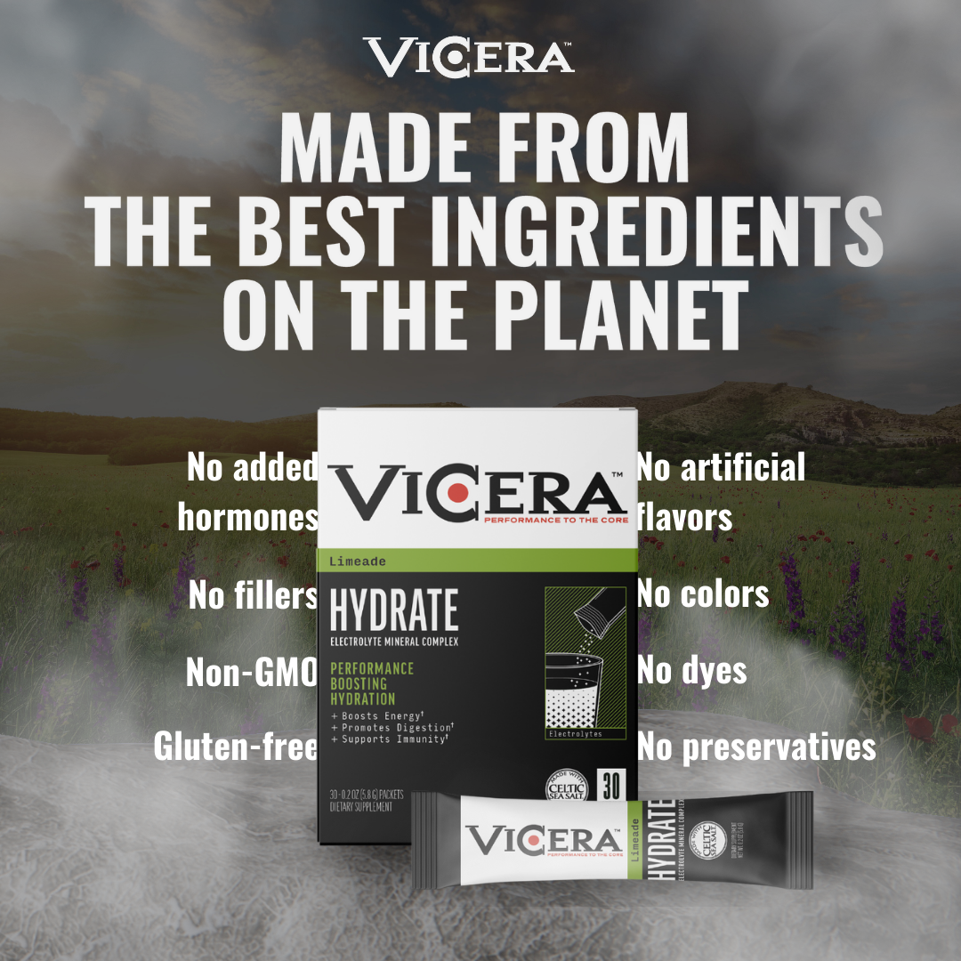 ViCera Hydrate is an INNOVATIVE cellular hydration formula harnessing the power of superfood minerals, delivering the ideal ratios of critical electrolytes sodium, potassium, magnesium, calcium and chloride for optimal performance. ViCera Hydrate goes beyond electrolytes, providing organic superfood-bound trace minerals such as selenium, copper, and chromium which are lost during perspiration, especially after exercise. In addition, a humic soil mineral blend provides dozens of organically bound minerals along with humic and fulvic acids. None of the leading hydration brands offer these unique and important trace elements!