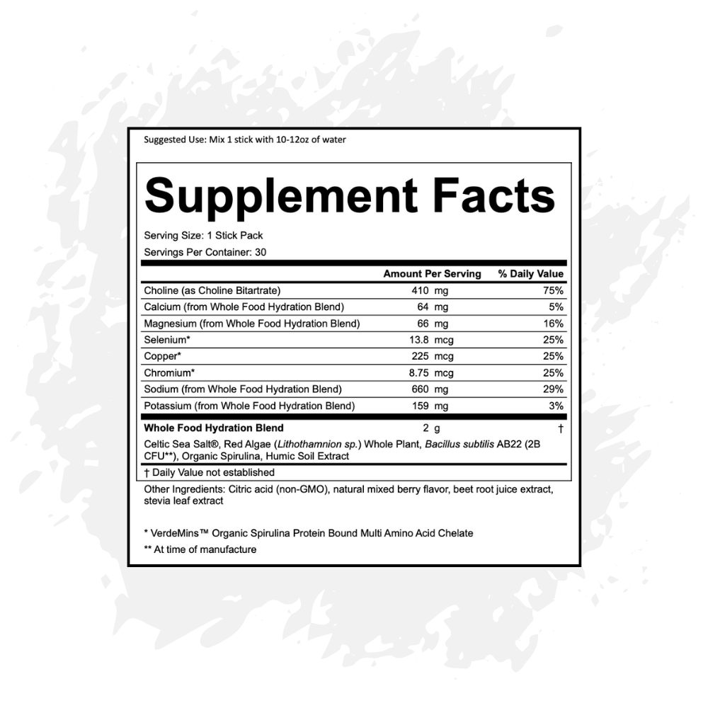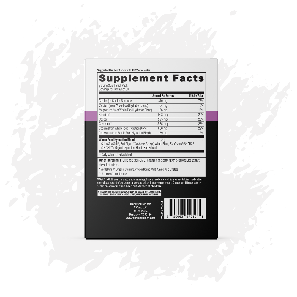 ViCera Hydrate is an INNOVATIVE cellular hydration formula harnessing the power of superfood minerals, delivering the ideal ratios of critical electrolytes sodium, potassium, magnesium, calcium and chloride for optimal performance. ViCera Hydrate goes beyond electrolytes, providing organic superfood-bound trace minerals such as selenium, copper, and chromium which are lost during perspiration, especially after exercise. In addition, a humic soil mineral blend provides dozens of organically bound minerals along with humic and fulvic acids. None of the leading hydration brands offer these unique and important trace elements!