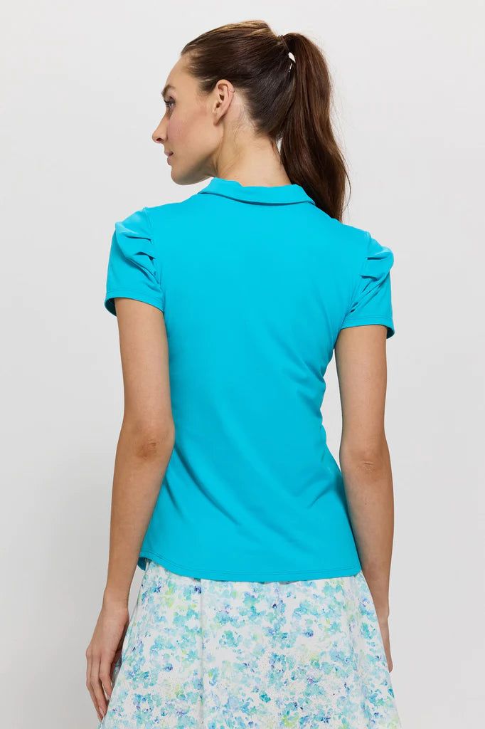 The Keyhole Polo is a must have for your golf wardrobe. It has a keyhole front placket with a one button closure and the sleeves are a 9” length. The highlight is the subtle pleating at the shoulder seams that just adds a unique feminine touch to this polo. It has a body skimming fit with a curved hemline.