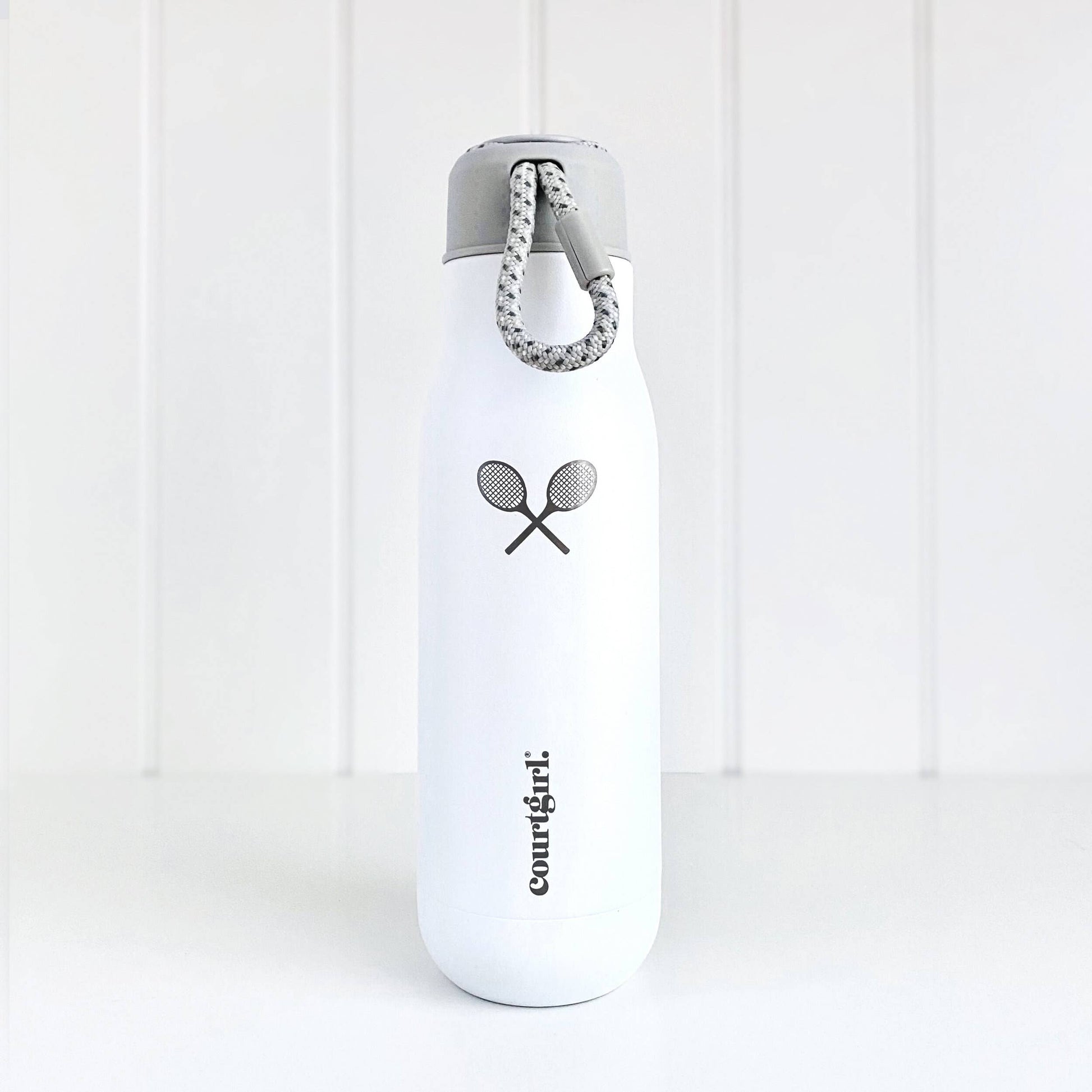 Crisp white with signature etched racquet logo — finally a match time bottle that works court side to keep you hydrated and styled. The unique parachute-grade bungee loop makes it easy to carry and hang on a hook. No more leaving your bottle on the floor during play!