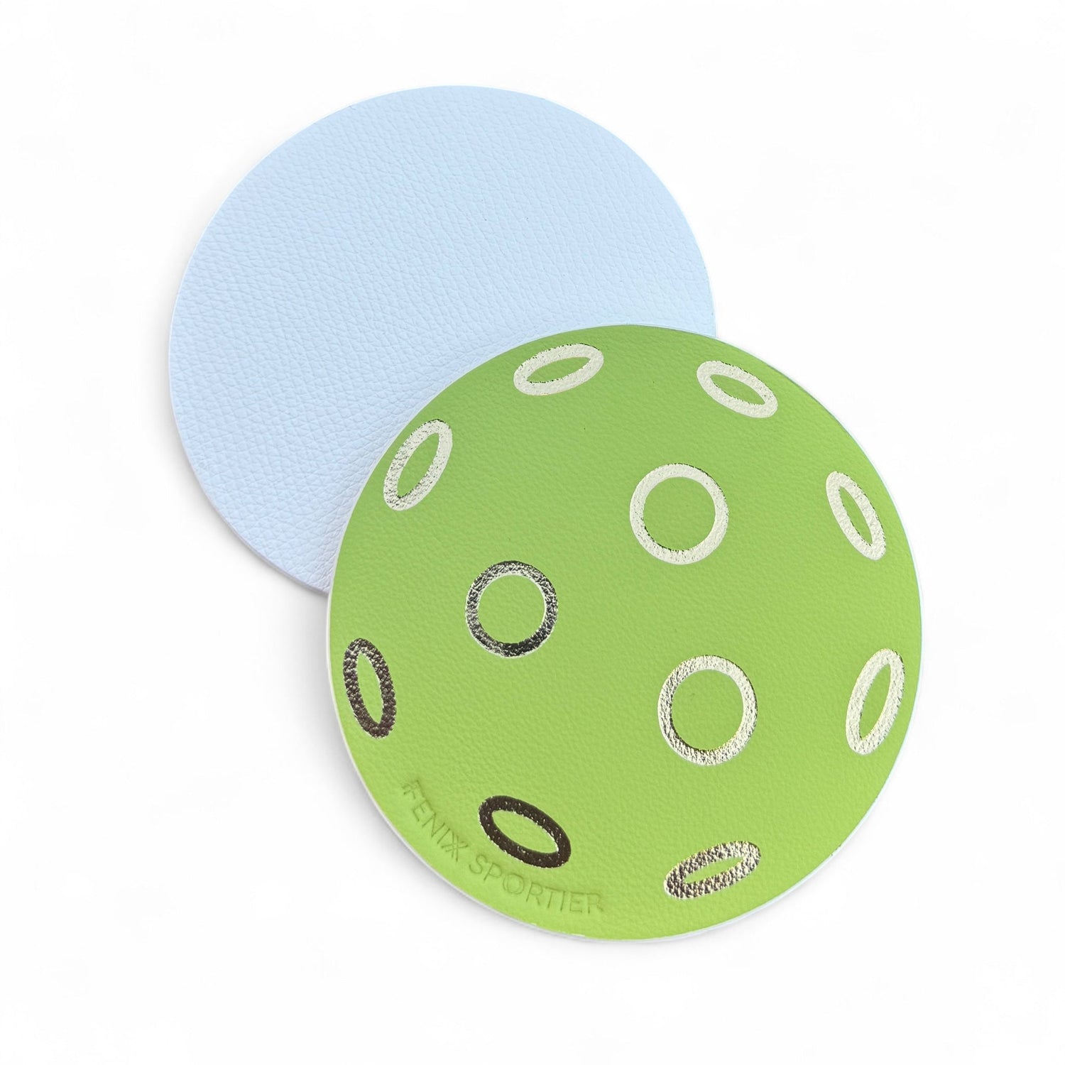 One side is Italian lime-colored leather with gold pickleball embossing. On the other side: white textured leather, which can be stamped/monogrammed with 1-3 initials in gold foil stamping or the phrase "PICKLEBALL ALL DAY EVERYDAY".